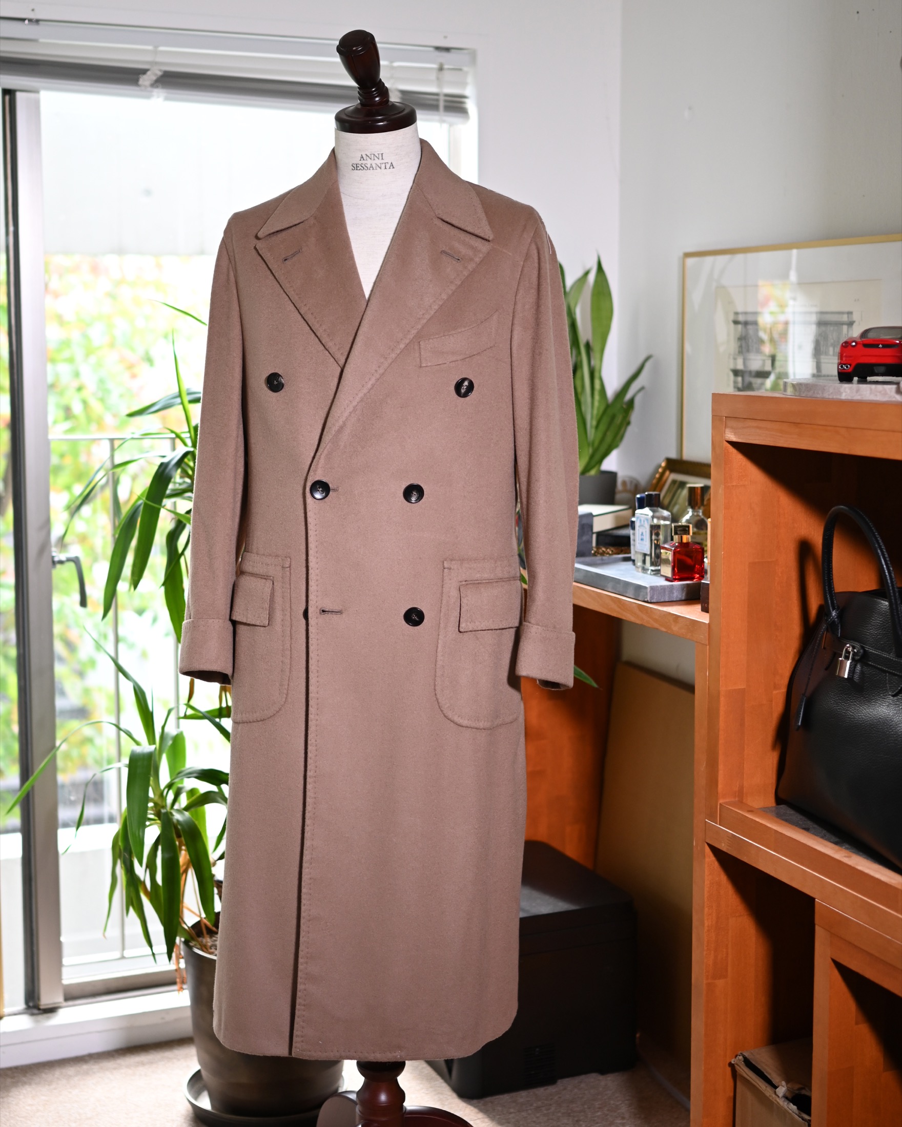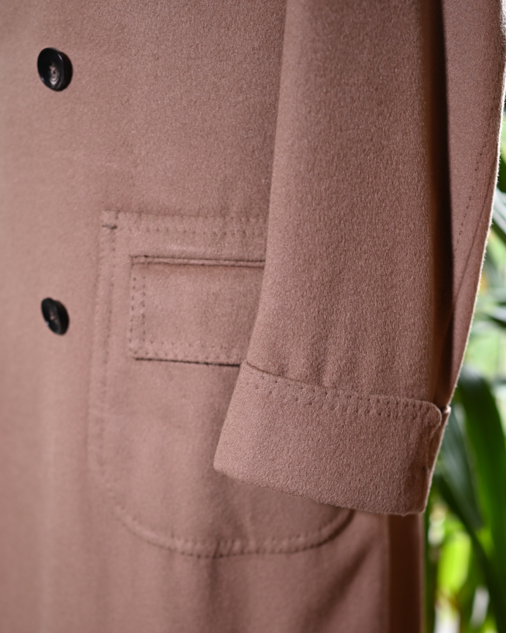 そしてこれもまた極上のロロピアーナ製100%カシミアを使用したコートである。最もオーセンティックなゴールデンベージュの、究極のスタンダードになる生地である。スーツの上に優雅に着こなすのはもちろんのこと、デニムとタートルネックニットの上に軽やかに羽織っても洒脱だ。