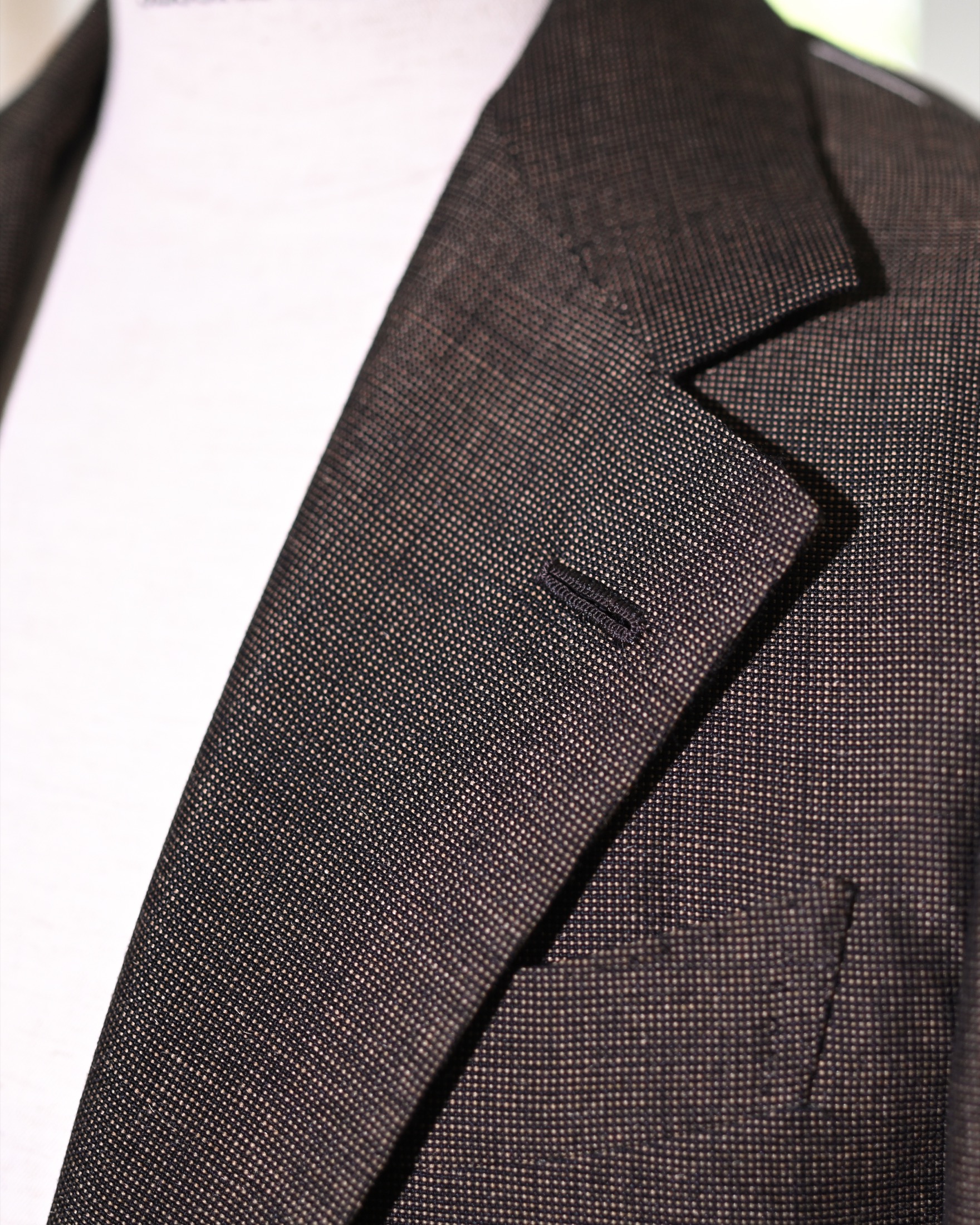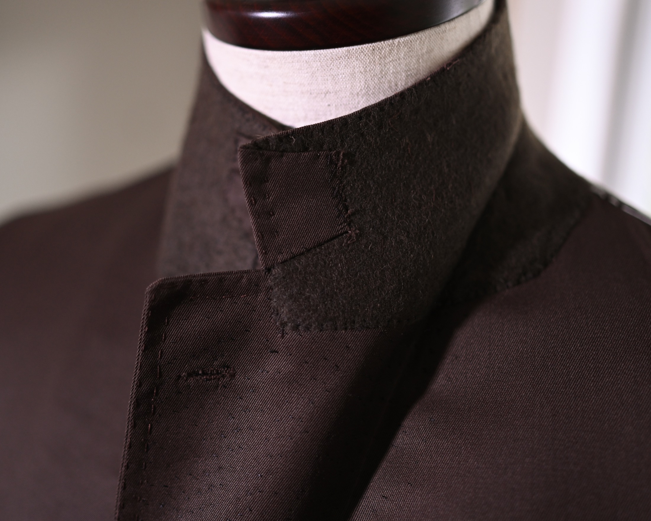 肩は自然に落ちるナポリらしい丸みを残し、軽やかでありながら優美な立体感を描く。胸元の柔らかなドレープ、伸びやかで堂々としたラペルがニコラ・ジョルダーノらしいカッティングである。