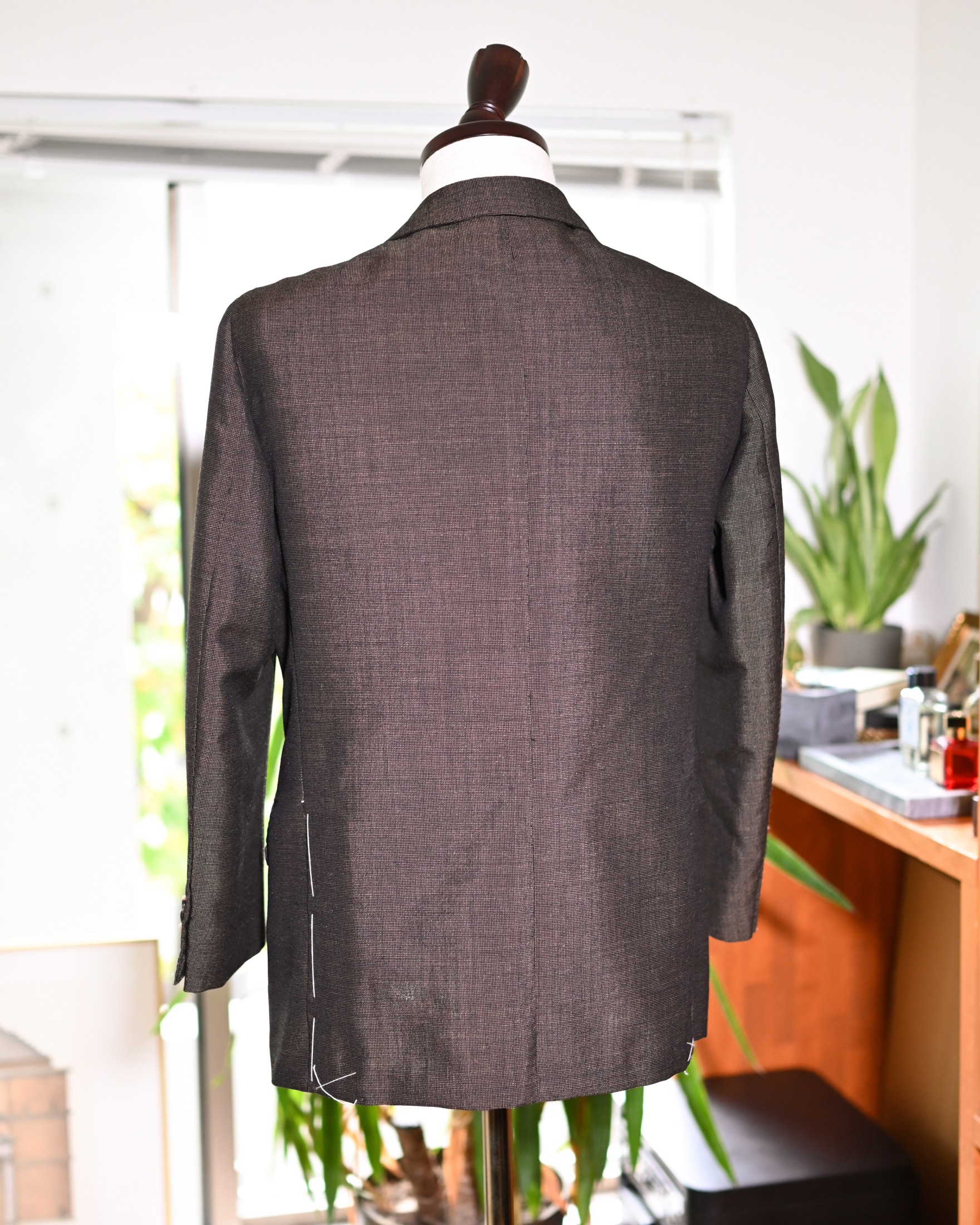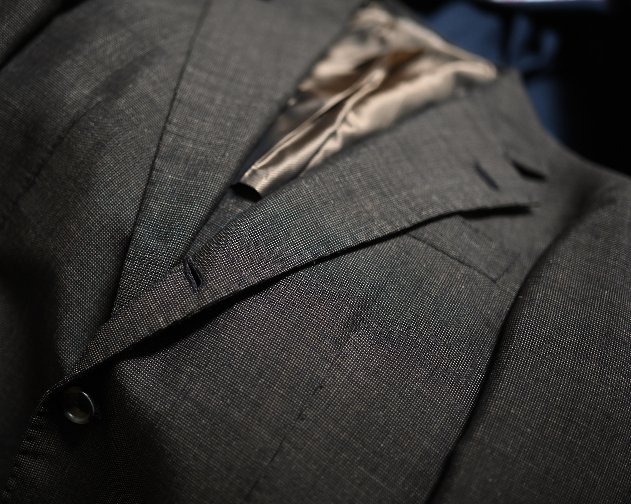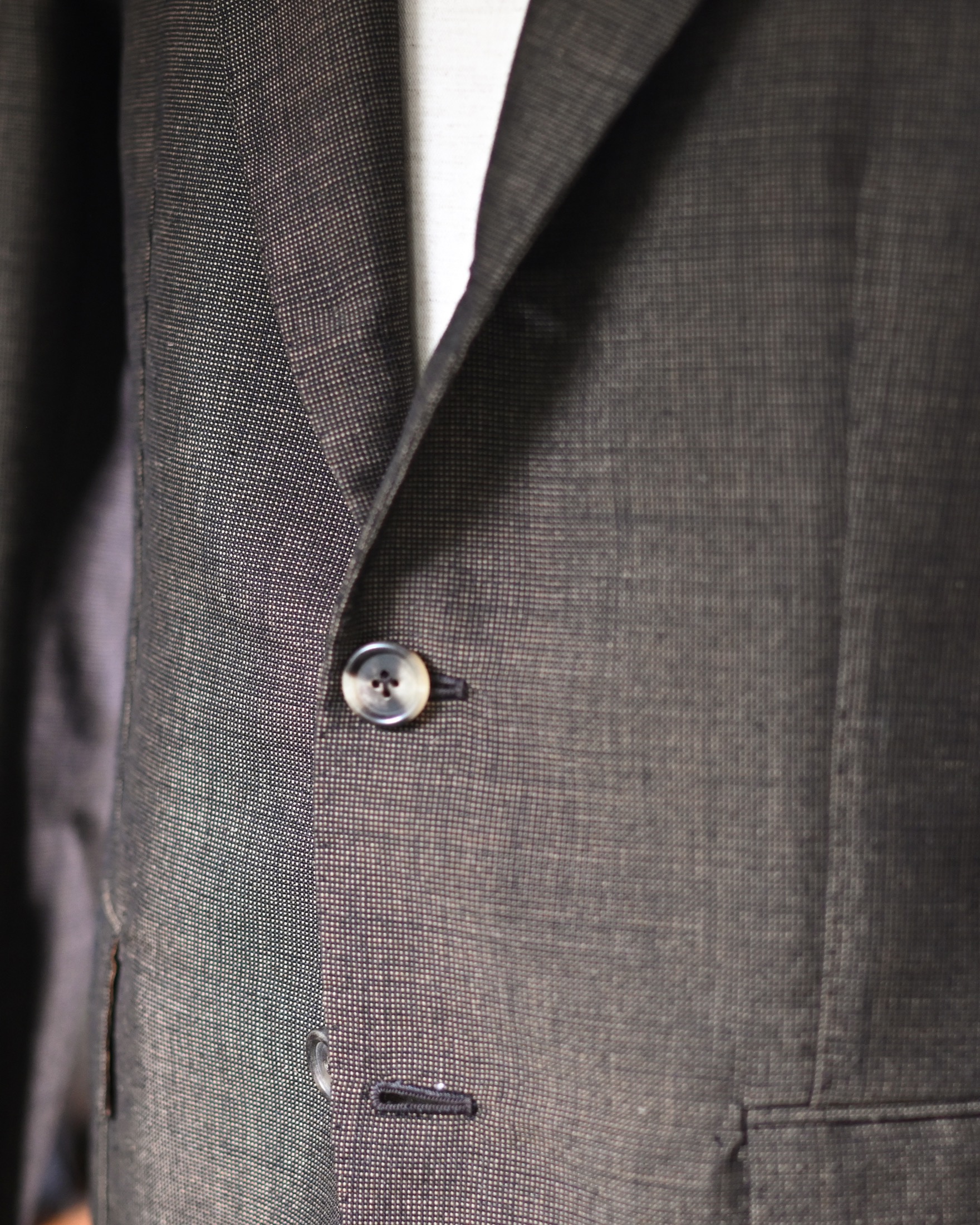 使用されているのは以前ブログでも紹介したビンテージの英国製モヘアウール。張りのある質感と軽やかな反発力で、美しい立体を描く。そして何よりも古い英国モヘア生地特有の気品ある光沢が実に美しい。身体に沿うのシャープな表情が軽快な仕立てと組み合わさった時の魔力は、写真で見るだけでもすぐに理解できる。