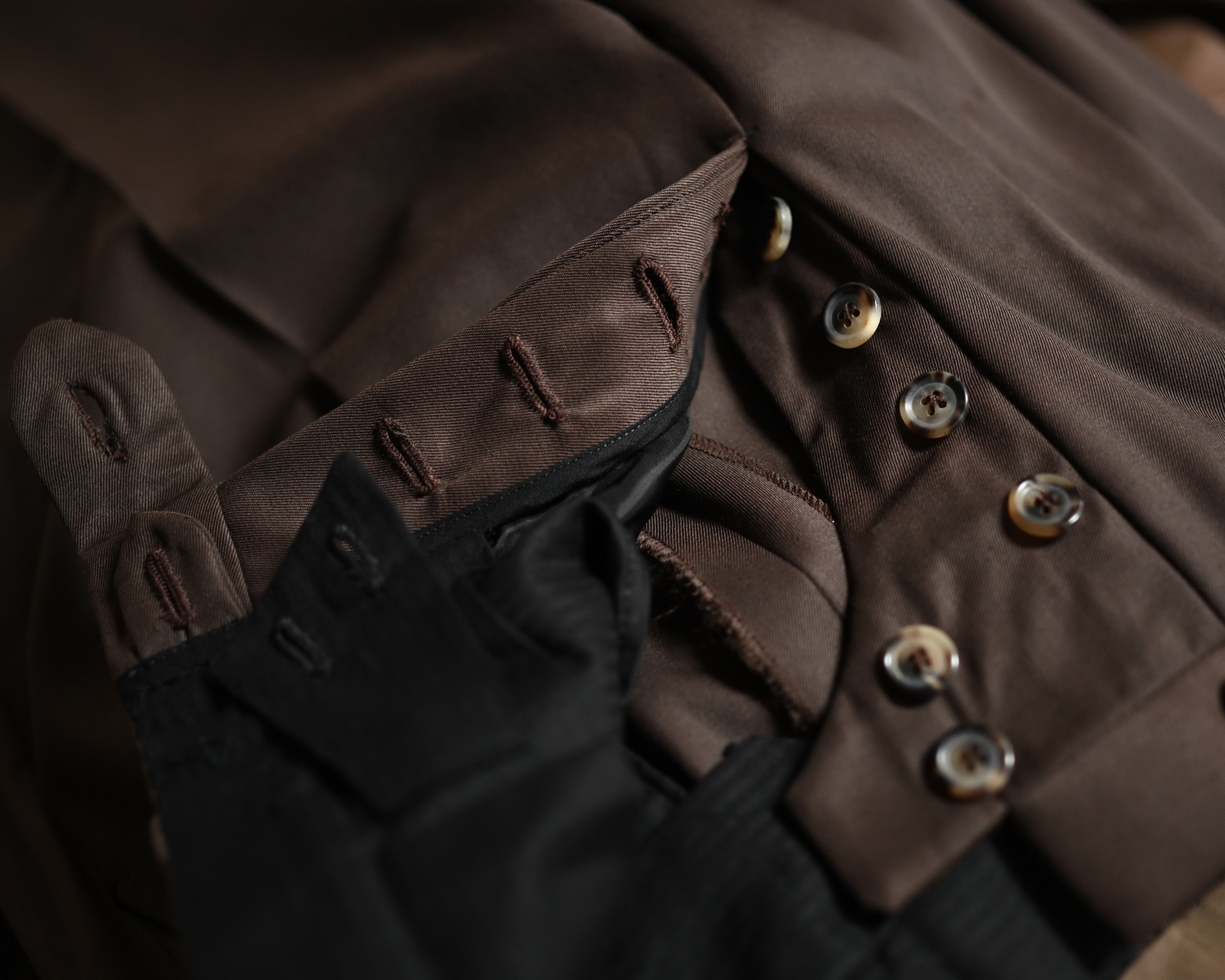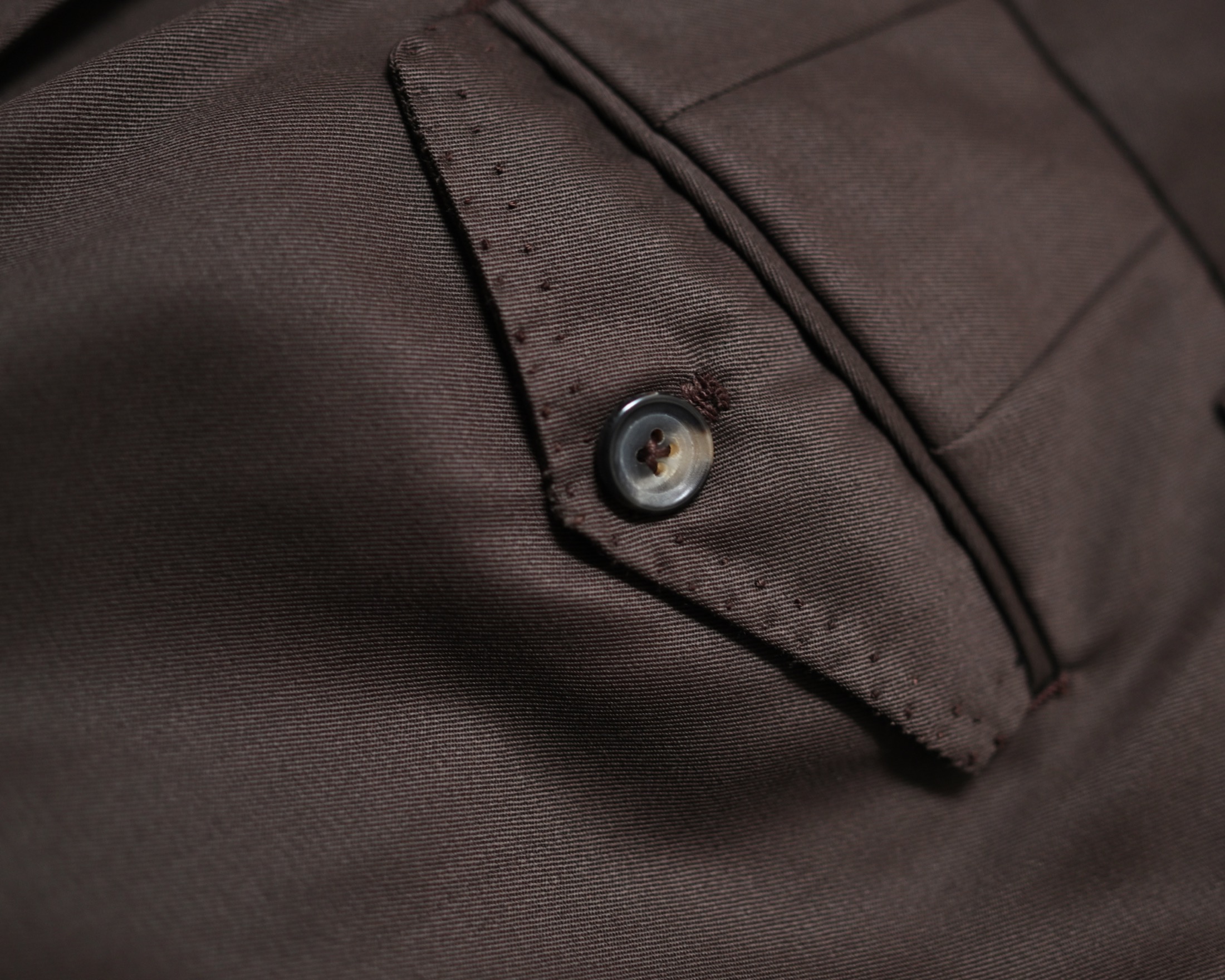 ローマの老舗生地商であるEUROTEXの軽快なキャバルリーツイルを使用。日本ではなかなか手に入らないが、EUROTEXの生地は最高だ。英国製の目付けの良さとイタリアの着心地、色味、肌触りを兼ね備えたこれ以上ないキャバルリーである。ブラウンのトーンは深く、光の当たり方で陰翳が移り変わる。クラシックでありながら艶を感じさせる。